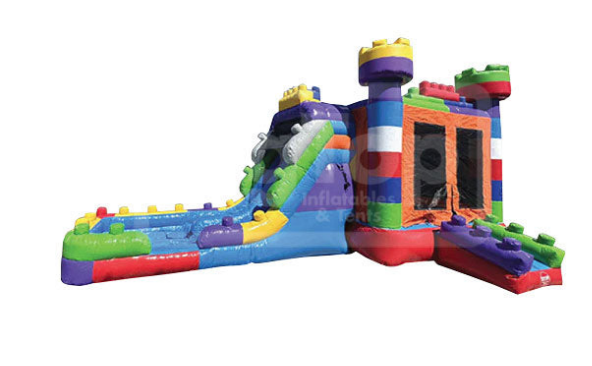 Wet or Dry Build a day of fun with the Fun Blocks Themed Combo Bounce House with Double Lane Slide and Splash Landing. This exciting inflatable play center combines a thrilling bounce house with an exciting double-lane water slide, all decked out in a captivating building block theme.